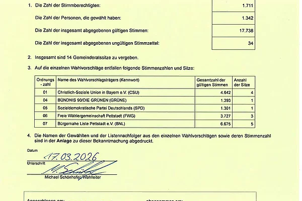 Am 8. März 2026 finden in Bayern die Kommunalwahlen statt. Auch die Bürgerinnen und Bürger der Gemeinde Pettstadt sind dann zum Wählen aufgerufen. Zur Durchführung der Wahl sind amtliche Bekanntmachungen gesetzlich vorgeschrieben.
