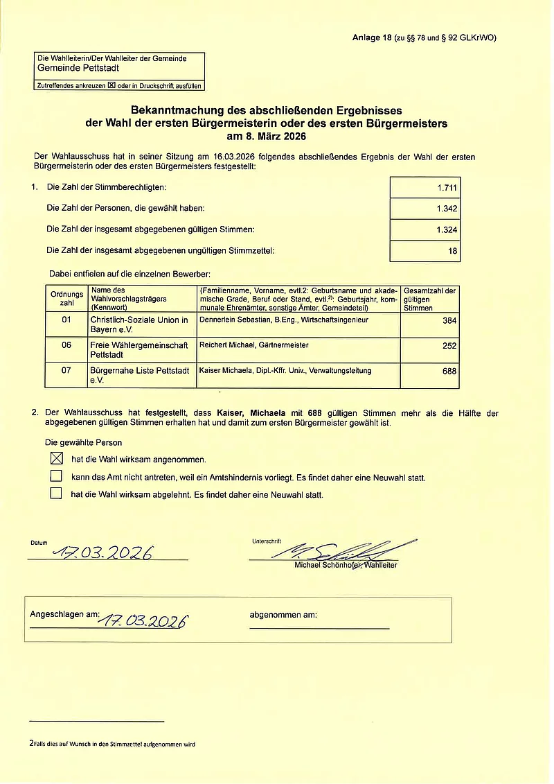 Nachrichtlich werden diese Bekanntmachungen zusätzlich auf der Homepage der Gemeinde Pettstadt (www.pettstadt.de) und im Mitteilungsblatt veröffentlicht. Es wird darauf hingewiesen, dass Rechtswirkungen (z. B. Beginn und Ende von Fristen) durch die öffentlichen Bekanntmachungen durch Aushang im Amtskasten vor dem Rathaus ausgelöst werden. Umfangreiche Informationen sowie den entsprechenden Wahlkalender finden Sie auf der Homepage des Bayerischen Landesamts für Statistik unter folgendem Link: www.stmi.bayern.de/media/03_wahlen-und-abstimmungen/PDFs/Wahlkalender_2026.pdf