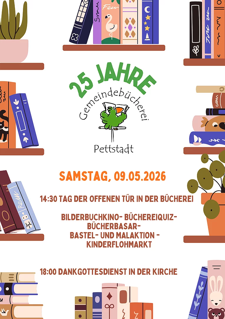 Die kleine Feier mit Angeboten für die Kinder beginnt um 14.30 Uhr vor und in der Bücherei. Um 18.00 Uhr feiern wir in der Pfarrkirche einen Gottesdienst zum 25-jährigen Bestehen der Einrichtung. Sie sind herzlich eingeladen!